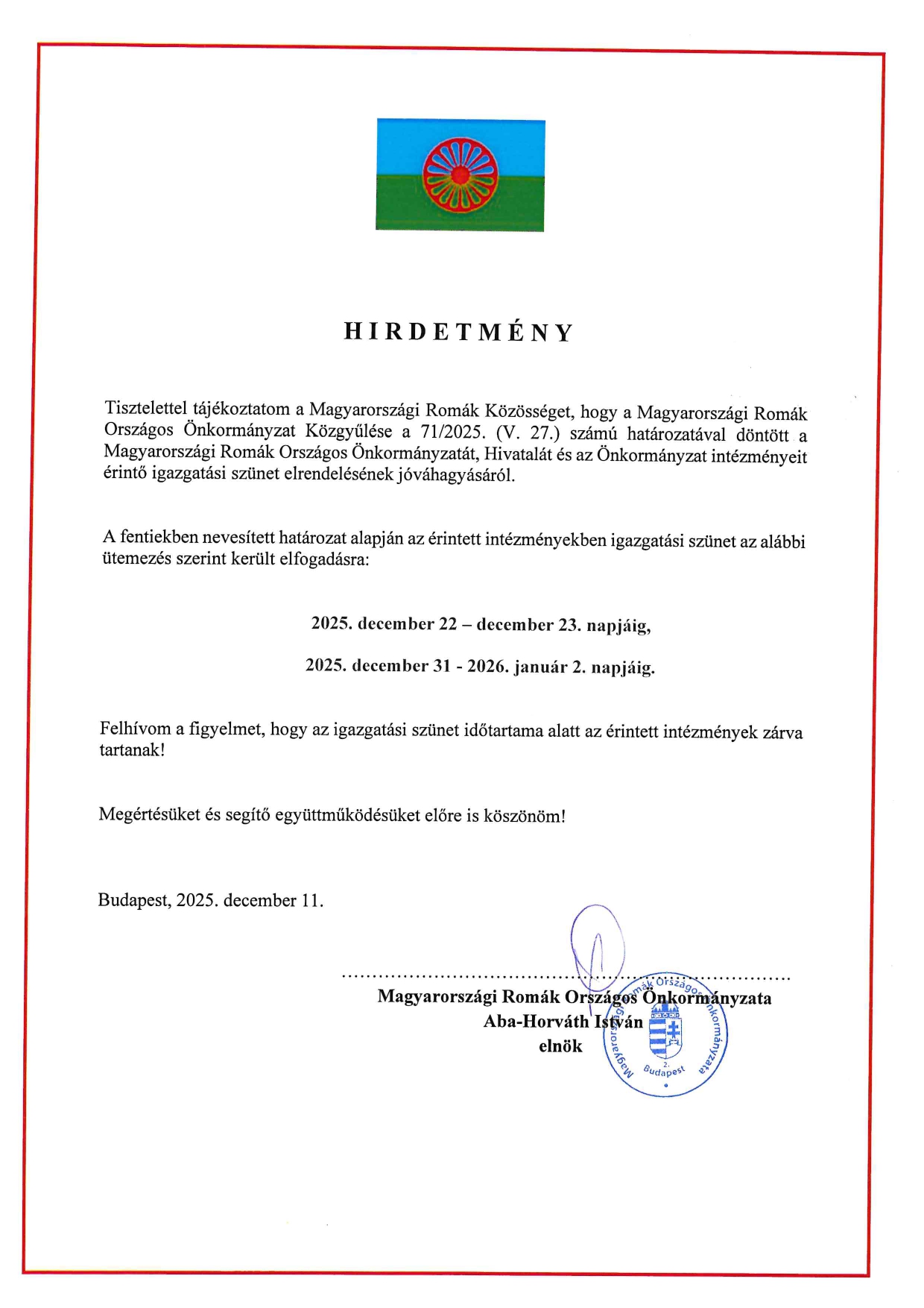 HIRDETMÉNY igazgatási szünet elrendeléséről 12 hours ezelőtt Országos Roma Önkormányzat Hivatala 21 Megtekintés Megosztás Facebook