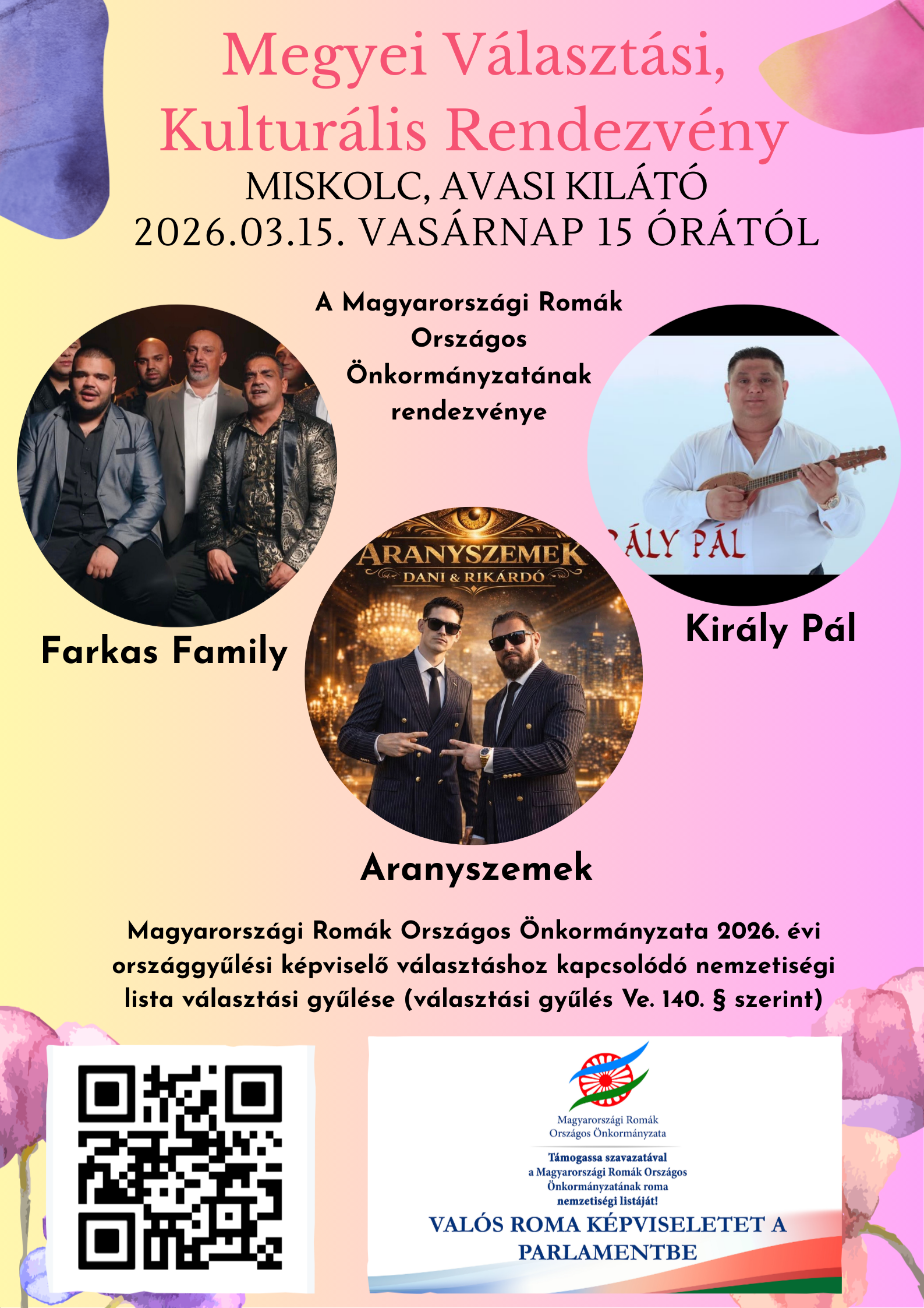 A Magyarországi Romák Országos Önkormányzata 2026. évi országgyűlési képviselő választáshoz kapcsolódó nemzetiségi lista választási gyűlésére (választási gyűlés Ve. 140. § szerint).