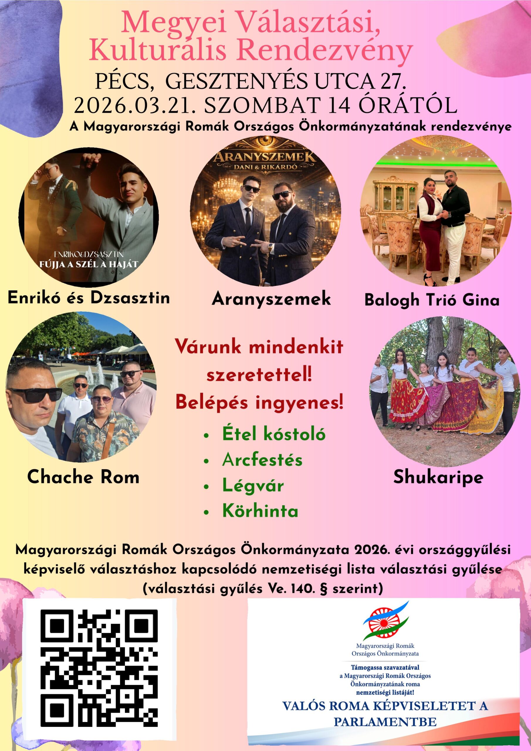 A Magyarországi Romák Országos Önkormányzata 2026. évi országgyűlési képviselő választáshoz kapcsolódó nemzetiségi lista választási gyűlésére (választási gyűlés Ve. 140. § szerint).